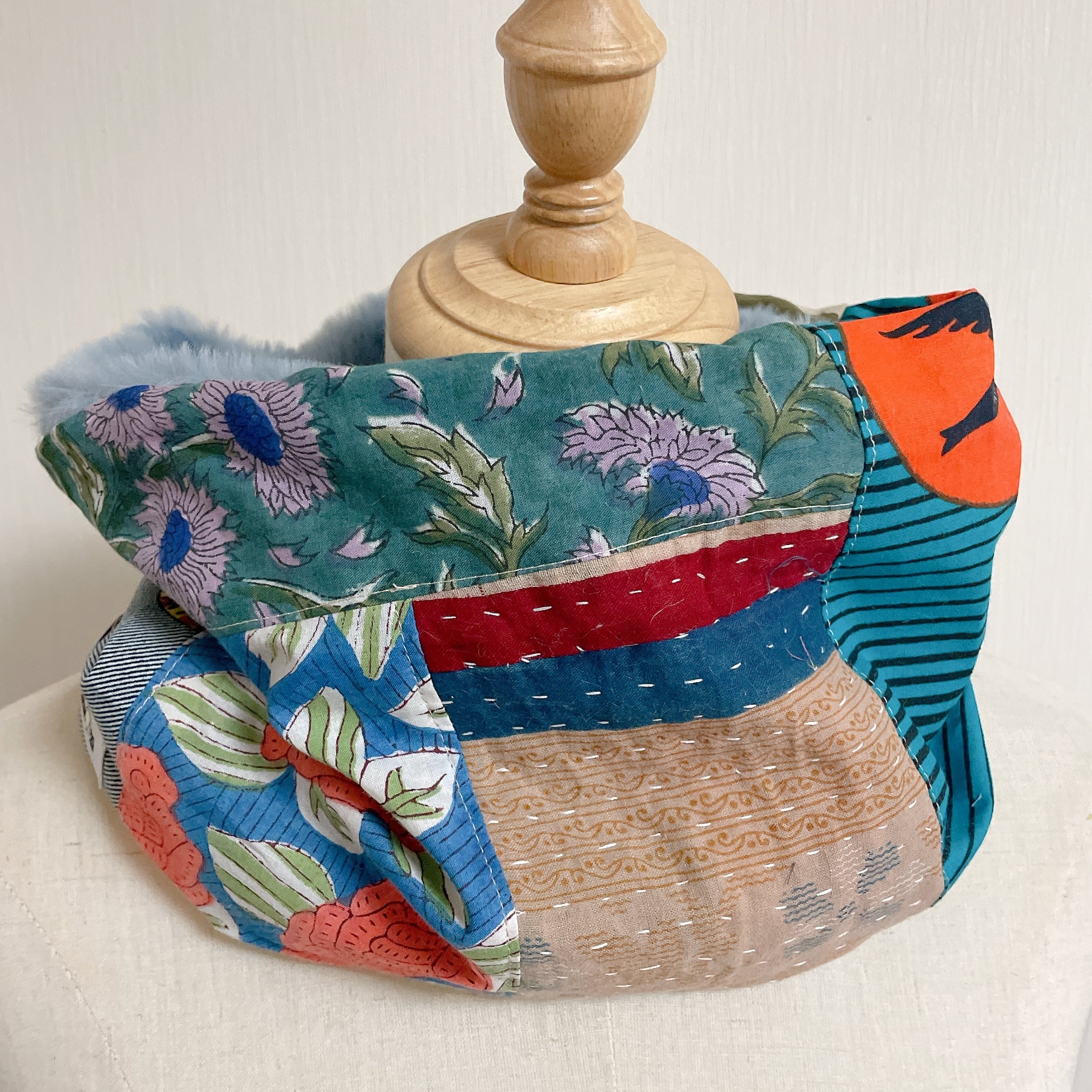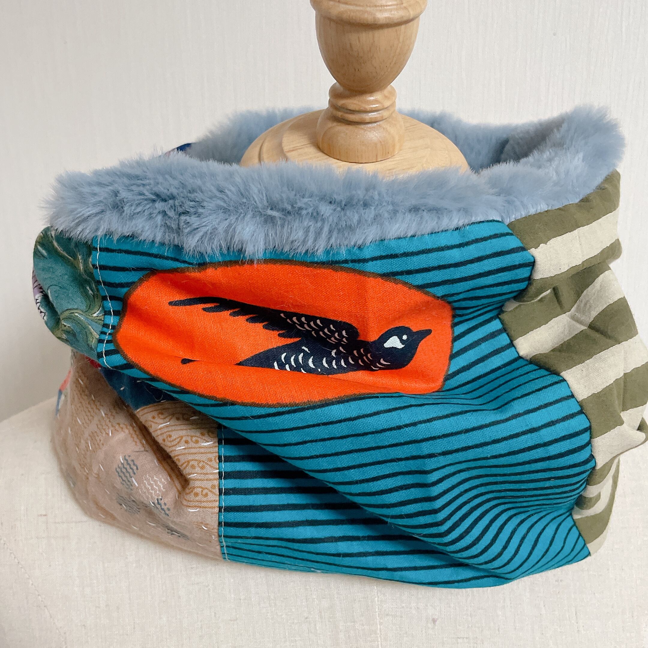 どこを前に持ってくるかで印象がガラリと変わるので、何通りも楽しめるスヌードです。